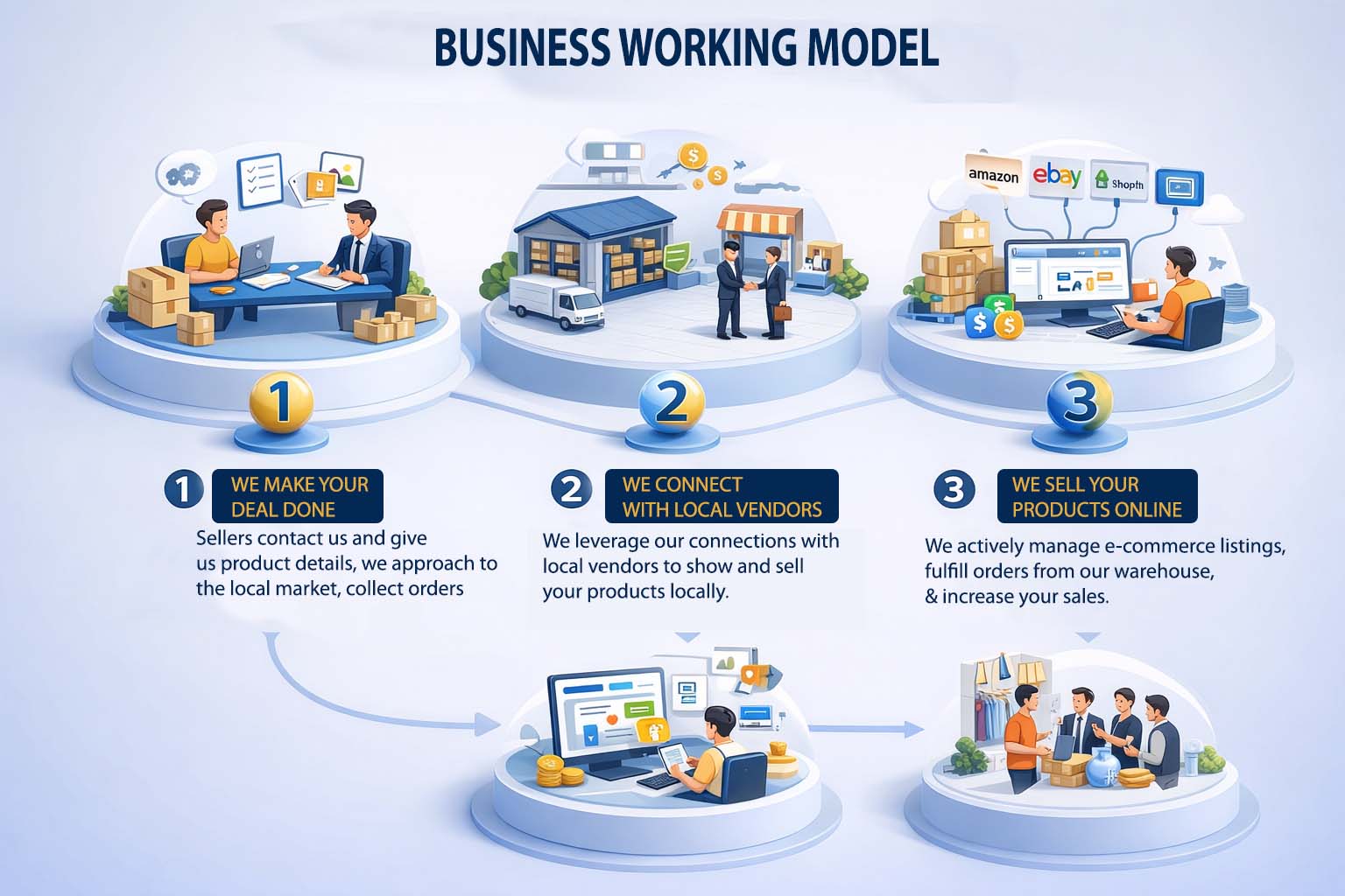 Comprehensive support from product listing and marketing to warehousing, fulfilment, and after-sales service.